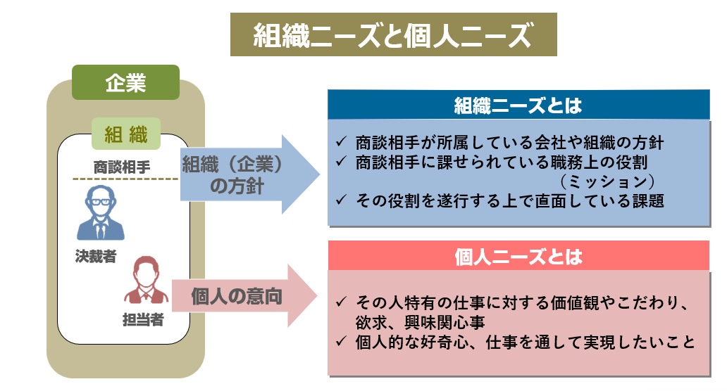 「そうだ。A子さんは雑談から入ったことで相手が安心して本音を話すきっかけを作れた。そして「上下の質問」を繰り返すことで相手の発言からより具体的な情報や、背景情報を聞き出すことができる。そこから組織ニーズや個人ニーズを引き出すことができたんだ。」